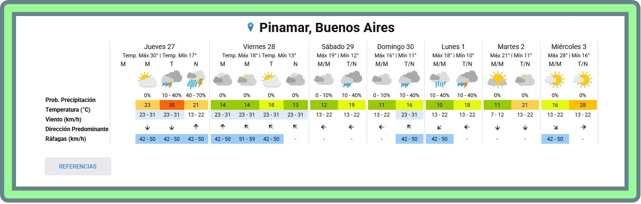 EL TIEMPO EN PINAMAR PARA ESTE JUEVES 27 DE NOVIEMBRE Y PROYECCIÓN PARA LOS PRÓXIMOS 6 DÍASLigeramente nublado - Humedad: 92 % Presión: 1010.9 hPa Viento: Norte a 12 km/h Visibilidad: 10 km Sol: 05:22 Puesta de Sol: 19:49 DEPORTES