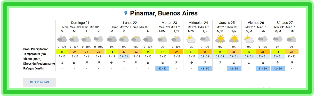 PRONÓSTICO DEL TIEMPO Y PROYECCIÓN PARA LOS PRÓXIMOS 6 DÍASLigeramente nublado - Humedad: 96 % Presión: 1006.6 hPa Viento: Norte a 6 km/h Visibilidad: 12 km Sol: 05:24 Puesta de Sol: 20:07 DEPORTES