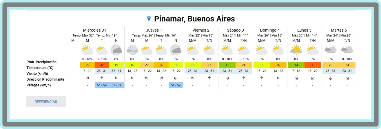 PRONÓSTICO DEL TIEMPO Y PROYECCIÓN PARA LOS PRÓXIMOS 6 DÍASLigeramente nublado - Humedad: 76 % Presión: 1006.8 hPa Viento: Norte a 8 km/h Visibilidad: 10 km Sol: 05:31 Puesta de Sol: 20:11 INTERNACIONALES