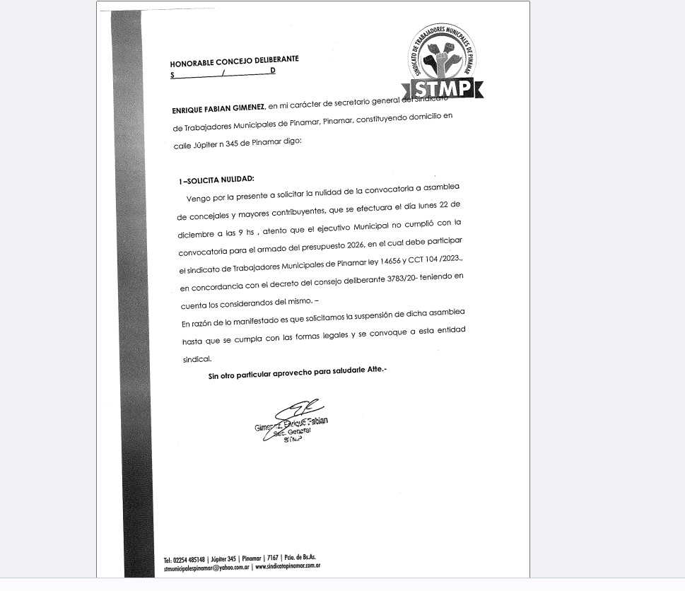 EL STMP REALIZÓ UNA PRESENTACIÓN PARA LA NULIDAD DE LA ASAMBLEA DE CONCEJALES Y MAYORES CONTRIBUYENTES PREVISTA PARA EL LUNES 22El Sindicato de Trabajadores Municipales de Pinamar realizó en la fecha una presentación en el Honorable Concejo Deliberante de Pinamar pidiendo la nulidad de la convocatoria a Asamblea de Concejales y Mayores Contribuyentes, prevista para el próximo lunes 22 de diciembre de 2025, argumentando que en oportunidad del armado del presupuesto del año 2026 el ejecutivo municipal no cumplió con la convocatoria para que participe el STMP, según lo establece el Decreto 3783/20 del H.C.D. POLÍTICA