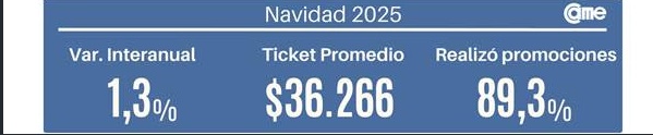 NAVIDAD 2025: SEGÚN CAME LAS VENTAS MINORISTAS SUBIERON 1,3% FRENTE AL AÑO PASADOLa Navidad 2025 se caracterizó por una alta implementación de acciones comerciales, alcanzando al 89,3% de los establecimientos. No obstante, el consumo reflejó una marcada austeridad y dependencia del crédito debido al nivel de endeudamiento y la retracción del poder adquisitivo de los hogares. ...LEER MÁS ... POLICIALES