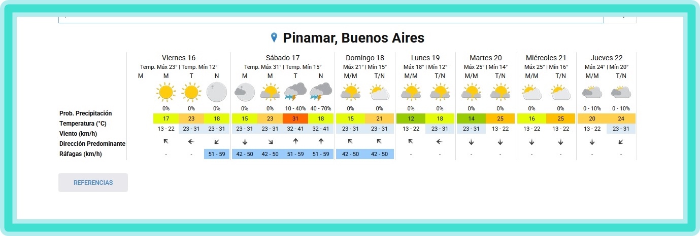 PRONÓSTICO DEL TIEMPO EN PINAMAR PARA ESTE VIERNES 16 Y PROYECCIÓN PARA LOS PRÓXIMOS 6 DÍASLigeramente nublado - Humedad: 84 % Presión: 1011.2 hPa Viento: Sur a 19 km/h Visibilidad: 10 km Sol: 05:45 Puesta de Sol: 20:09 NACIONALES