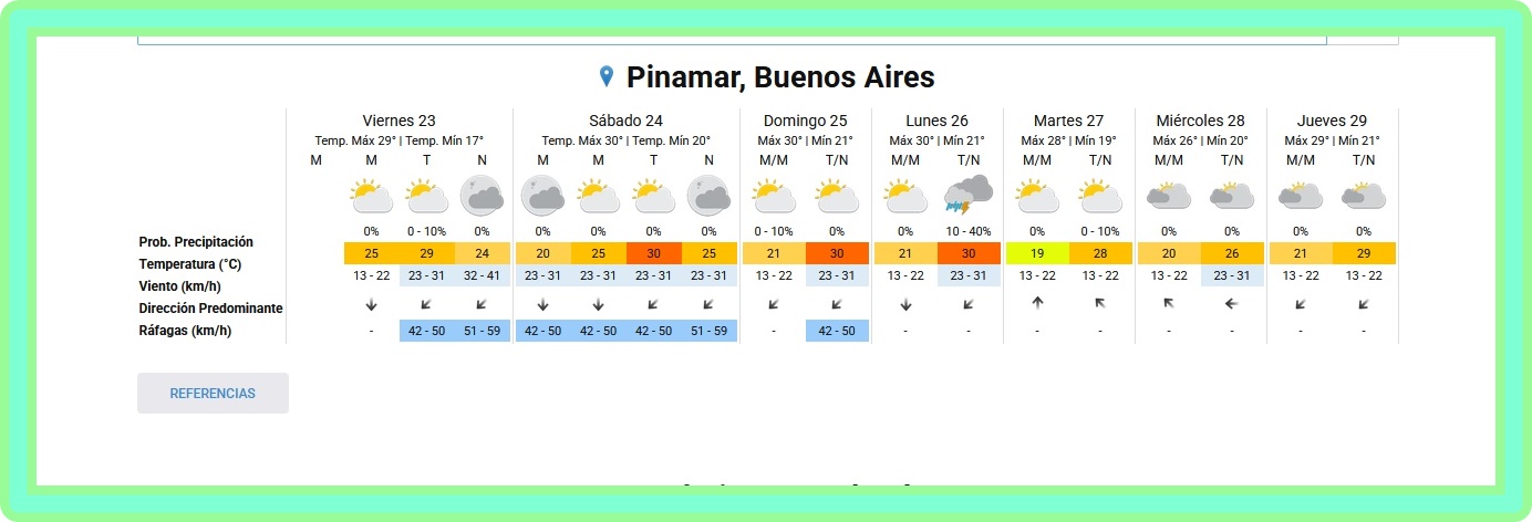 PRONÓSTICO DEL TIEMPO EN PINAMAR PARA ESTE VIERNES 23 Y PROYECCIÓN PARA LOS PRÓXIMOS 6 DÍASLigeramente nublado - Humedad: 82 % Presión: 1017.3 hPa Viento: Norte a 10 km/h Visibilidad: 10 km Sol: 05:53 Puesta de Sol: 20:05 SALUD