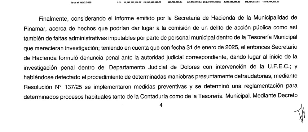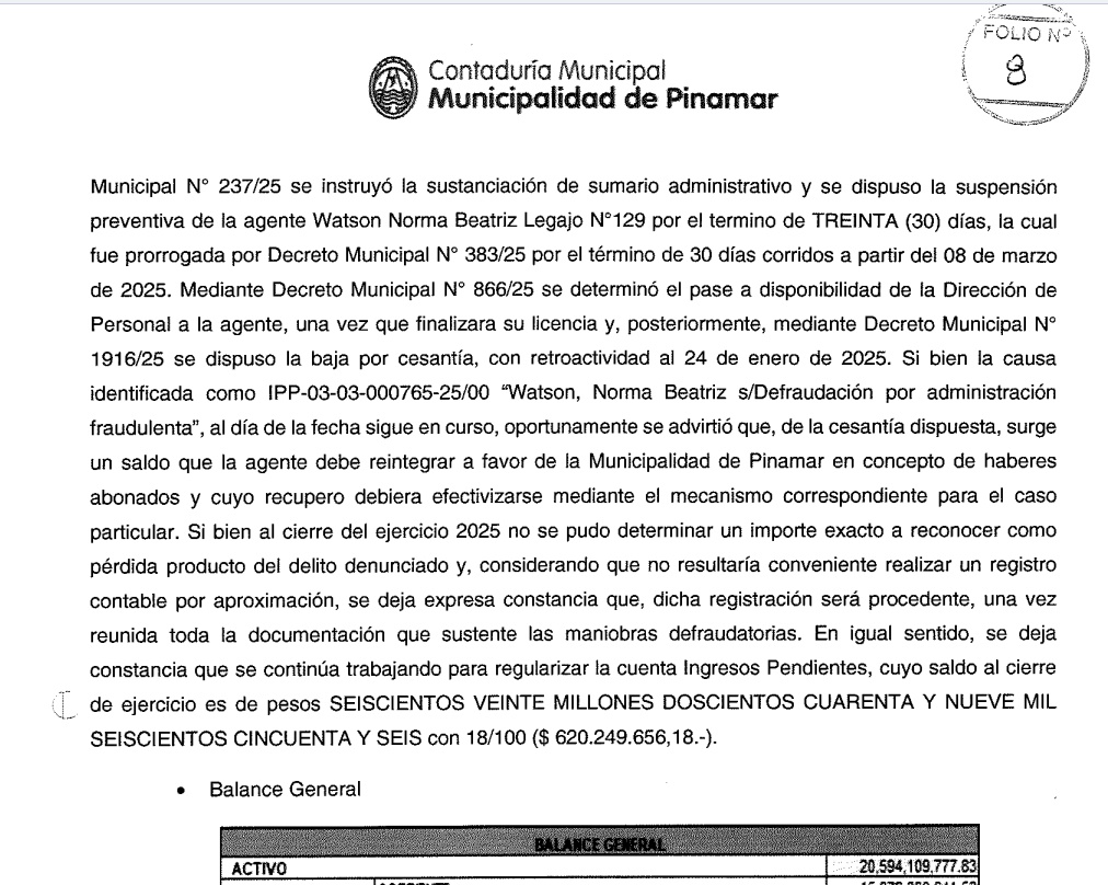Lo que incomoda y debe ser objeto de análisis por parte de los contribuyentes de Pinamar es el contraste del Intendente Municipal Juan Ibarguren entre lo que dice y la enorme brecha que existe con lo que hace; entre lo que proclama y que no puede sostener en la gestión y que tiene un enorme costo para los vecinos y contribuyentes. El simple análisis de la rendición de cuentas ejercicio 2025 que es el expediente Nº 4123 - 0000464/2026 que consta de 3 cuerpos con 537 fojas al que accedió este medio, en la fojas 7 y 8 pretende explicar un faltante de $ 620.249.656,18 "en el que deja constancia que se está trabajando" para regularizar la cuenta de "Ingresos Pendientes", cuyo saldo al cierre del ejercicio 2025 arroja la suma mencionada. Esta cifra tiene un correlato con el delito de acción pública y de graves faltas administrativas imputables al personal municipal dentro de la Tesorería hecho denunciado "el 31 de enero del 2025 en la justicia". ....LEER MÁS Y HACIENDO "CLIC" EN IMÁGEN DEL INTENDENTE SE INCOPORAN COMO DOCUMENTO LAS FOJAS 7 Y 8 DE LA RENDICIÓN DE CUENTAS EJERCICIO 2025.