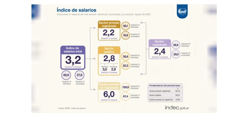 LOS SALARIOS SE UBICARON POR ENCIMA DE LA INFLACIÓN Y SUBIERON 3,2% EN AGOSTOLos salarios registraron una suba del 3,2% en agosto y se ubicaron por encima de la inflación de ese mes, la cual fue del 1,9%, según informó el Instituto Nacional de Estadísticas y Censos (INDEC). En la medición interanual, contra agosto del 2024, se incrementó un 49,6%. También quedó por encima de la inflación interanual, que fue del 33,6%. Y con respecto a diciembre del 2024 acumula una suba de 27,6%, como producto del alza en el sector privado no registrado (67,4%), público (22,5%) y privado registrado (18,8%).. ...LEER MÁS .... NACIONALES