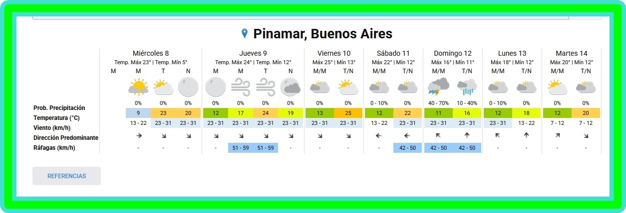 EL TIEMPO EN PINAMAR PARA ESTE MIÉRCOLES 8 DE OCTUBRE Y PROYECCIÓN PARA LOS PRÓXIMOS 6 DÍASDespejado - Humedad: 86 % Presión: 1017.6 hPa Viento: Sur a 19 km/h Visibilidad: 10 km Sol: 06:12 Puesta de Sol: 18:58 DEPORTES