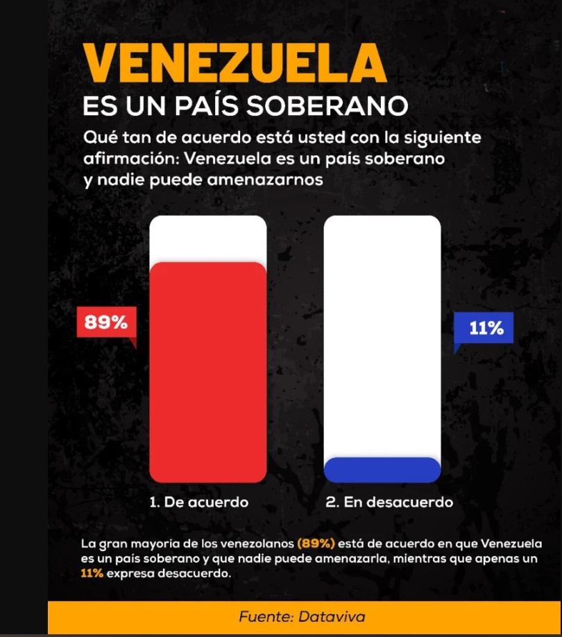 91% DE LOS VENEZOLANOS CONSIDERA EL PETRÓLEO COMO EL VERDADERO MOTIVO DE LAS AMENAZAS DE TRUMPUna reciente encuesta nacional de Dataviva, revela que el pueblo venezolano está unido en torno a la defensa de su soberanía nacional. El sondeo, realizado entre el 1 y el 15 de septiembre, también muestra un notable aumento en la afinidad hacia el presidente constitucional de Venezuela, Nicolás Maduro, que se atribuye a su manejo de las recientes agresiones de Estados Unidos. ...LEER MÁS .... INTERNACIONALES