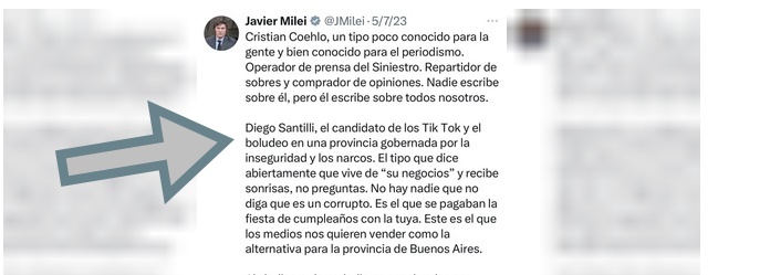 LOS DEMOLEDORES TUITS DEL PRESIDENTE MILEI CONTRA DIEGO SANTILLI, HOY CANDIDATOAllá por 2023, el libertario -todavía en el llano- armó un hilo de X contra “la casta”, en donde apuntó contra varios políticos. Uno de ellos fue el por entonces precandidato a gobernador bonaerense por el PRO, Diego Santilli al que llamó “el candidato de los TikTok y el boludeo en una provincia gobernada por la inseguridad y los narcos”. ....LEER MÁS .... POLÍTICA